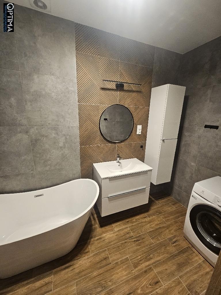 przestronna sypialnia główna z dużą garderobą i własną łazienką z wanną oraz pralką – idealna strefa relaksu po intensywnym dniu.