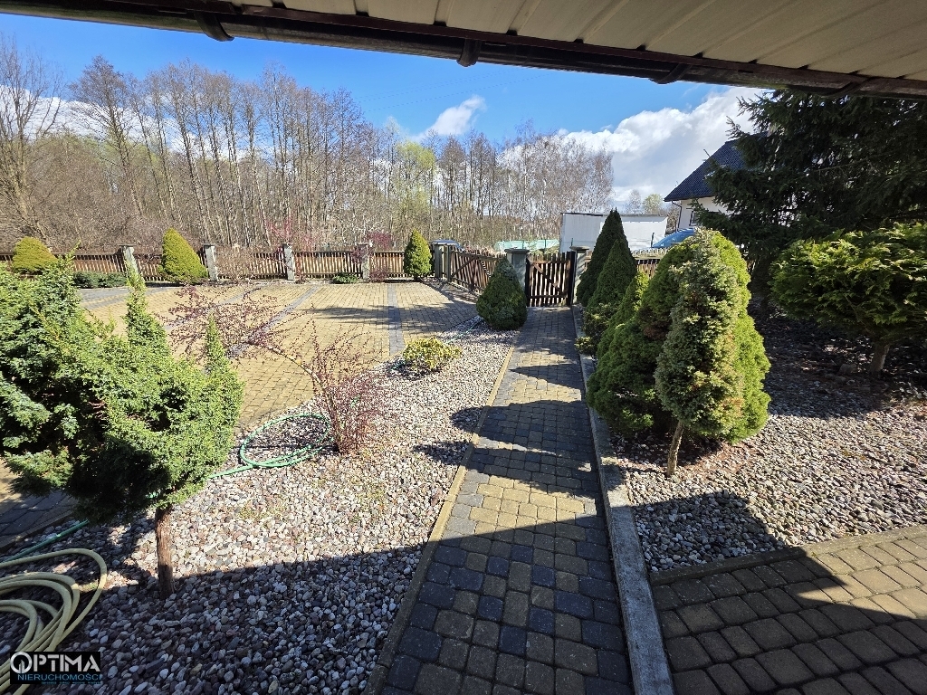 Posesja została starannie zagospodarowana – znajdziemy tu liczne nasadzenia, zadbane krzewy ozdobne oraz utwardzone ciągi komunikacyjne z kostki brukowej. Teren jest funkcjonalny i przygotowany do komfortowego użytkowania przez cały rok.